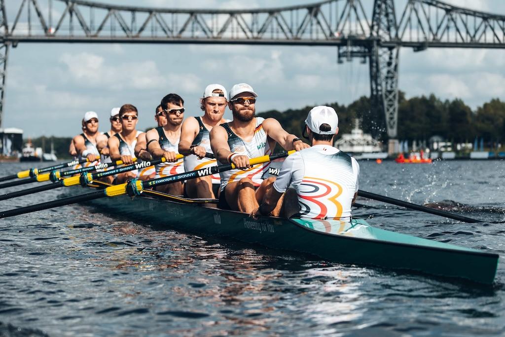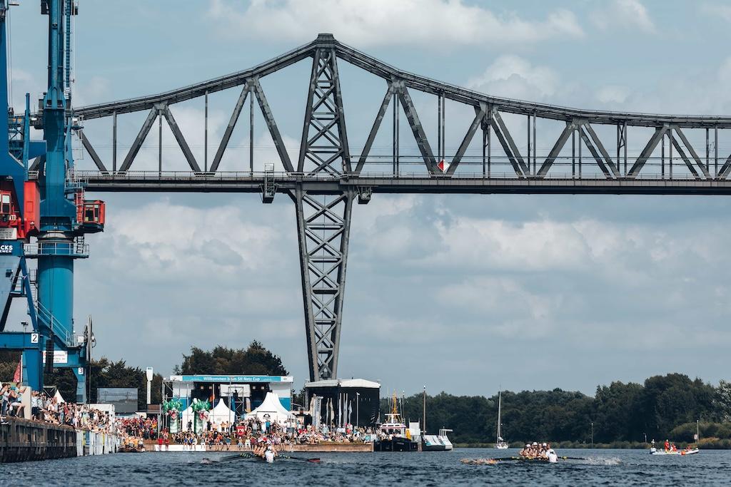 Der Sonnabendabend beim 25. SH Netz Cup bot den Zuschauern am Nord-Ostsee-Kanal packenden Rudersport auf höchstem Niveau. Im 350-Meter-Sprint setzten sich die deutschen Boote in beiden Hauptrennen durch – bei den Männern mit einem Doppelerfolg im Achter, bei den Frauen mit einem souveränen Premierensieg im Doppelvierer.