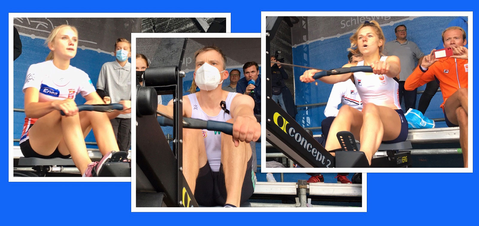 Kurz darauf kamen auch die Steuerleute beim Wettstreit auf dem Ergometer ins Schwitzen. Und dabei sollte es gerecht zugehen. Martin Sauer aus dem Deutschlandachter erhielt also zwei Handicaps: Er musste 500 Meter durchhalten, und das auch noch mit Maske. Die Frauen gingen auf die 350 Meter-Strecke. Gemessen wurde jeweils die Durchschnittszeit. Aleksandra Kołodziejska (Polen) wurde zweite, Eline Berger (Holland 8) wurde dritte.