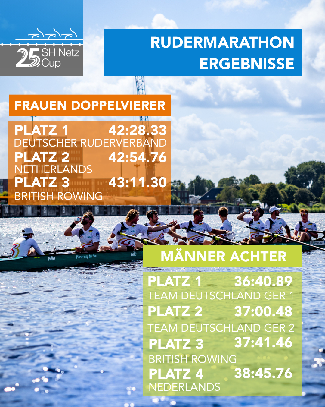 Unser Medienpartner NDR zeigte dazu den Bericht auf ndr.de: SH Netz Cup 2025: Deutsche Frauen machen Doppelerfolg perfekt. Erstmals waren auch die Frauen bei dem Rudermarathon am Start. Der Deutschland-Achter der Männer war ebenfalls siegreich.