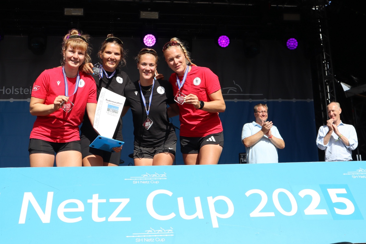 Cup-Organisator Florian Berndt freute sich, zum Jubiläum erstmals auch die Frauen-Doppelvierer in Rendsburg begrüßen zu können. „Das zu koordinieren, war durchaus ein Wagnis. Aber es hat hervorragend geklappt“, sagte er im Nachgang. Die Frauen aus dem deutschen Doppelvierer um und Pia Greiten kannten den SH Netz Cup natürlich bereits, haben ihn immer aus der Ferne verfolgt und sich trotz der enormen Streckenlänge sehr auf ihre erste Teilnahme gefreut. „Das war heute schon eine kleine Challenge“, so Sarah Wibberenz während der Siegerehrung nach dem Rudermarathon. „Aber wir haben viel mehr Spaß gehabt als wir zuerst dachten.“