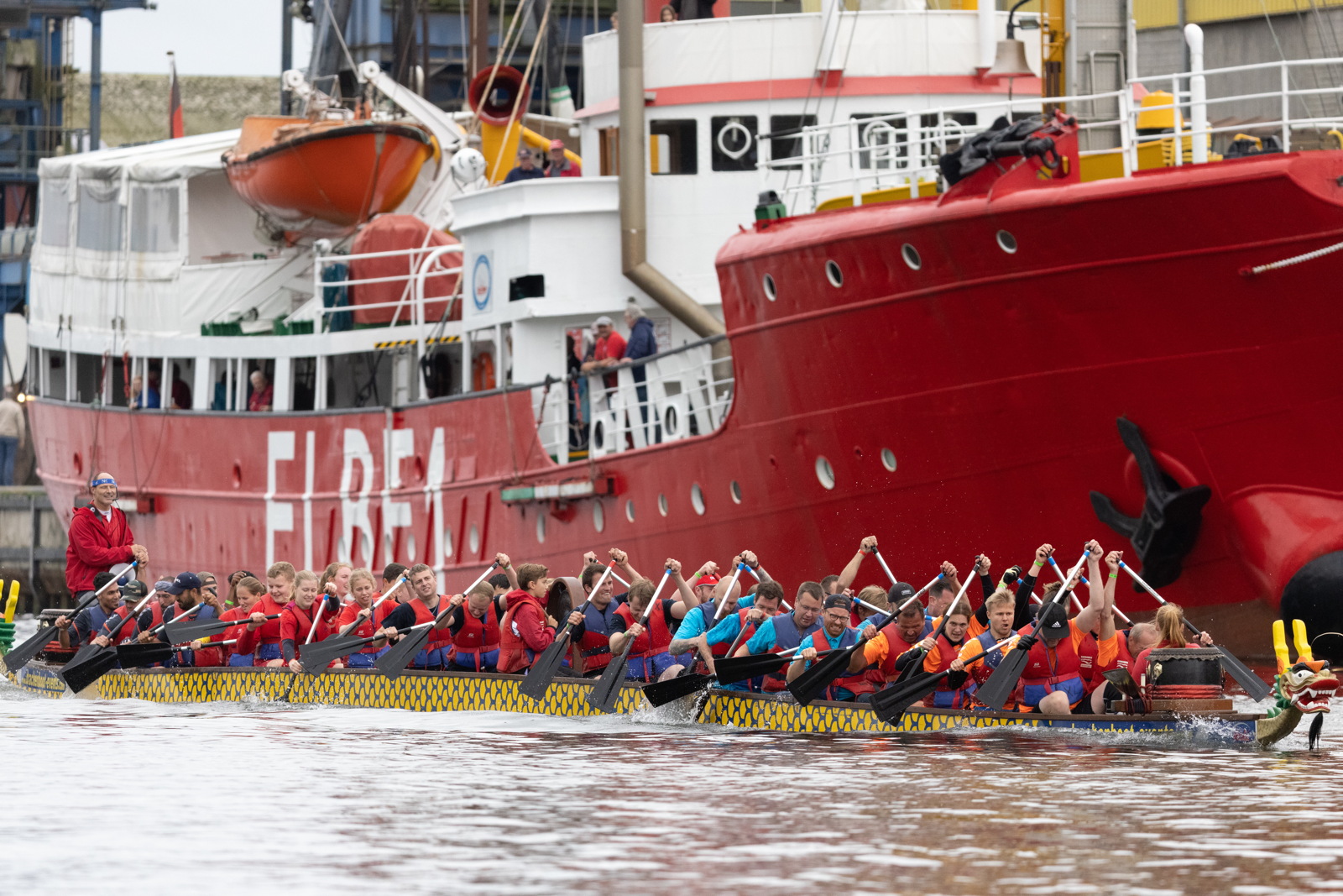 Modus Vorentscheid: Jeweils 20 Teams à 10 Personen plus Trommler*in treten in 10er Drachenbooten gegeneinander an und ermitteln die 10 besten Teams nördlich und südlich des Nord-Ostsee-Kanals.