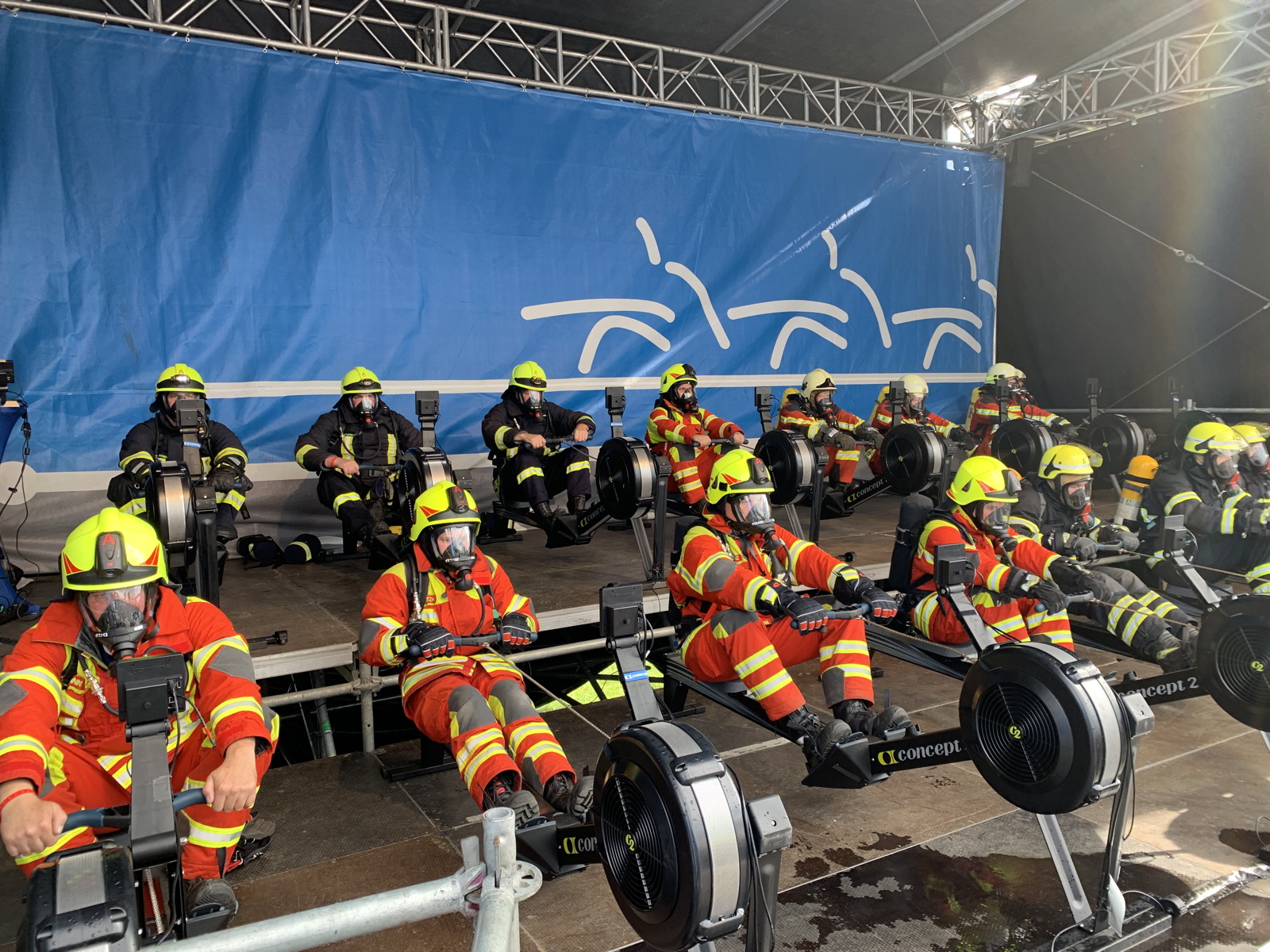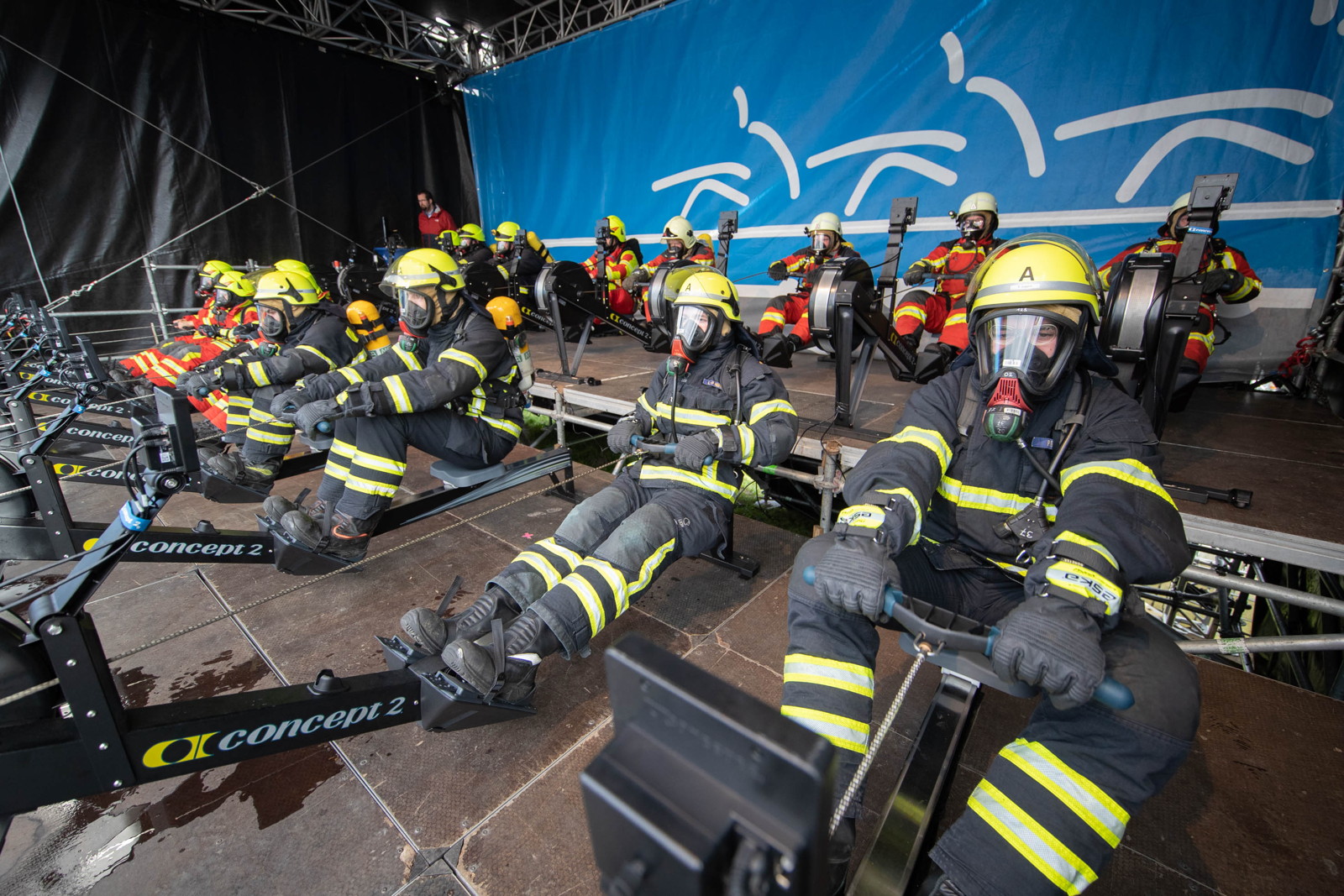 Wettbewerb 4 PA Träger/-innen je Feuerwehr rudern auf dem Ergometer zusammen gegen weitere Teams in kompletter Einsatzschutzkleidung unter Atemschutz in einer Zeit von 90 Sekunden, zusätzlich erfolgt eine finale Entscheidung der vier besten Teams!